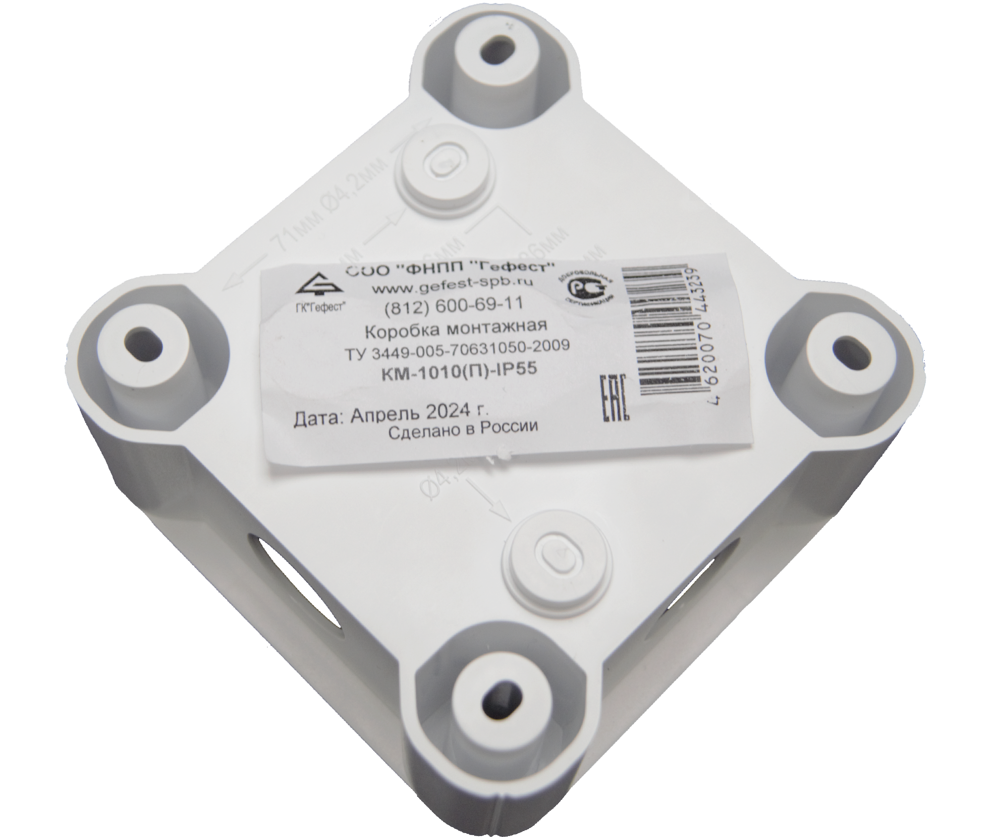 Корпус коробки изготовлен из огнестойкого самозатухающего пластика, устойчивого к ультрафиолетовому излучению. Конструкция Корпус коробки монтажной КМ(П) имеет квадратную форму и изготовлен из огнестойкого самозатухающего пластика толщиной 2 мм, устойчивого к ультрафиолетовому излучению.