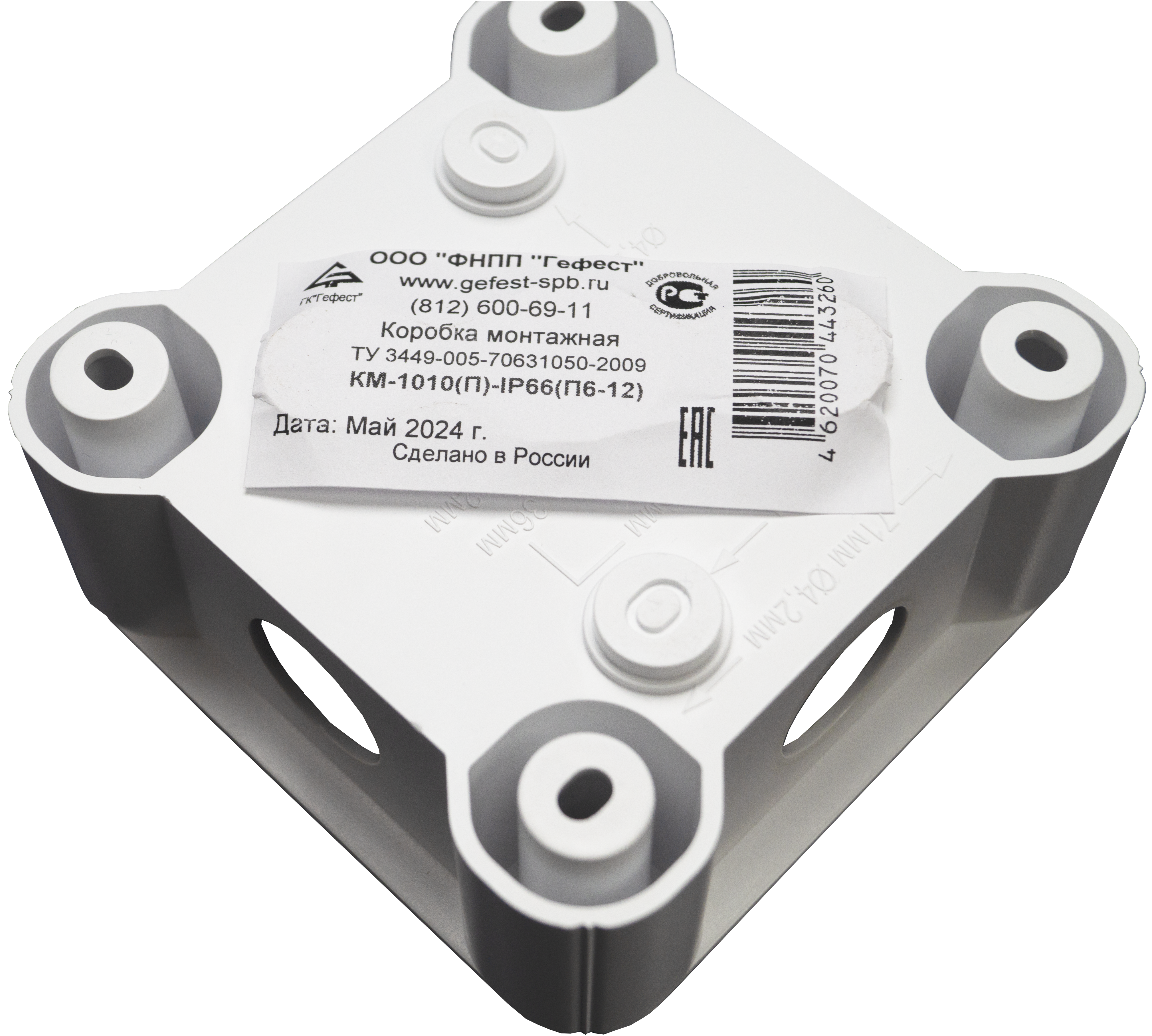 Корпус коробки изготовлен из огнестойкого самозатухающего пластика, устойчивого к ультрафиолетовому излучению. Конструкция Корпус коробки монтажной КМ(П) имеет квадратную форму и изготовлен из огнестойкого самозатухающего пластика толщиной 2 мм, устойчивого к ультрафиолетовому излучению.