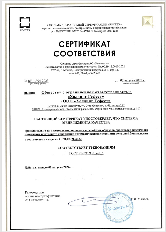 QSI удостоверяет, что система менеджмента качества вышеуказанной организации была проверена и признана соответствующей требованиям стандарта ISO 9001:2015. Область сертификации: производство и продажа технических средств пожарной автоматики.Условие на применение знака соответствия от 28.08.2023 подтверждает, что ООО «ФНПП Гефест» имеет право использовать знак соответствия на период действия сертификатов (КВ.1.392-2023 от 02.08.2023) в любой форме, в рекламных буклетах, проспектах, брошюрах, плакатах, бланках организационно-распорядительной документации организации.