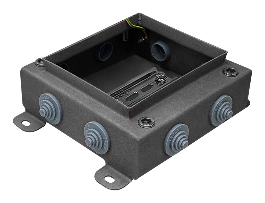 Внутри корпуса монтажной коробки установлена стальная гальванизированная DIN-рейка Ω-типа шириной 35 мм и высотой 7,5 мм, предназначенная для крепления клеммных колодок. Также могут использоваться клеммные колодки для навесного монтажа, например, клеммы Wago.