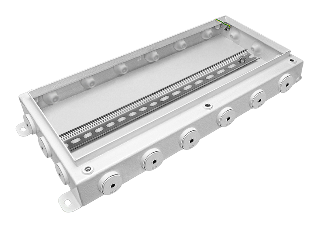 Коробки оснащаются DIN-рейкой для крепления клемм. На крышке и корпусе располагаются заземляющие зажимы «РЕ».