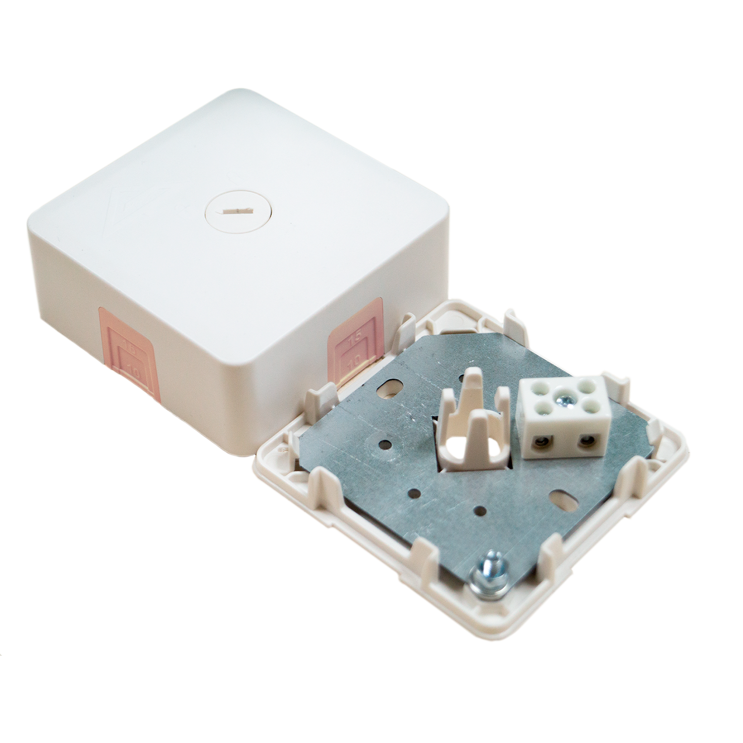 Корпус коробки имеет квадратную форму и изготовлен из самозатухающего пластика, толщиной 1,5 мм. Коробка состоит из основания, крышки и металлической площадки с керамическими клеммами. В основании коробки имеются отверстия для крепления её к несущей конструкции, а также защёлка, при помощи которой к основанию крепится металлическая площадка с клеммами. На площадке также имеется винт заземления. Металлическая площадка изготовлена из оцинкованной стали толщиной 0,5 мм.