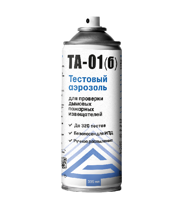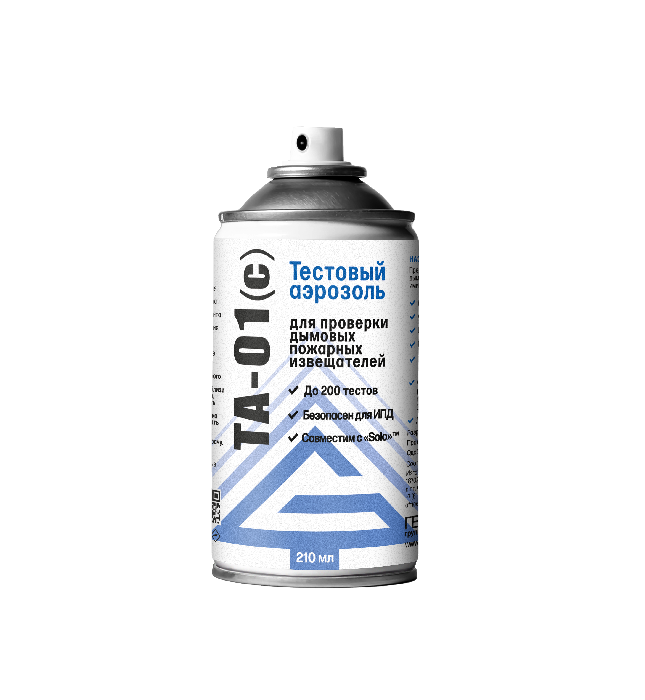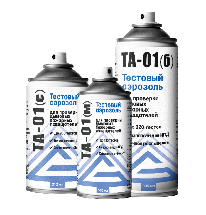 Тестовый аэрозоль ТА-01 предназначен для контроля функционирования дымовых пожарных извещателей различных типов в качестве имитатора натурного (тестового) очага пожара. Формы выпуска: ТА-01(м) — 140 мл, ТА-01(с) — 210 мл, ТА-01(б) — 345 мл.